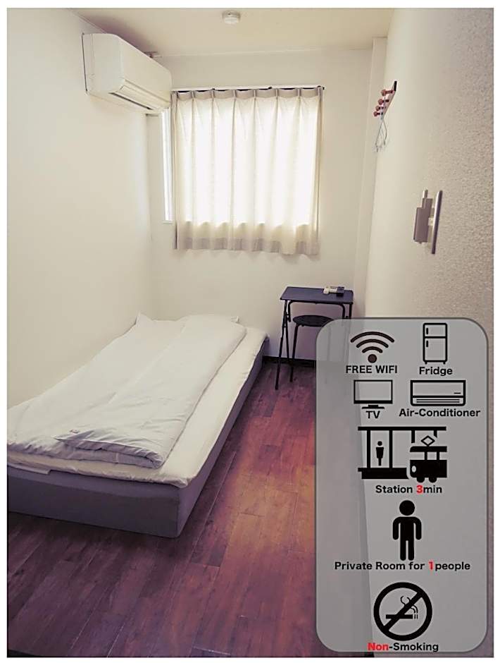 The single room features air conditioning, tatami, as well as a shared bathroom boasting a hairdryer and slippers. Rooms on the upper floors are reachable by elevator. The unit has 1 futon.